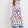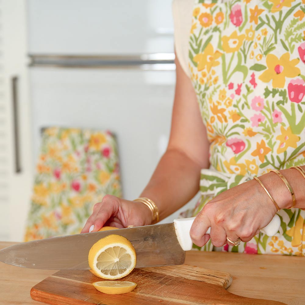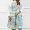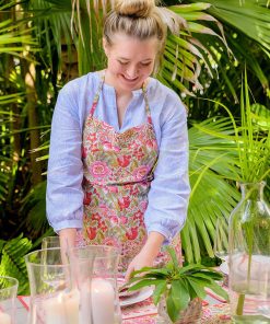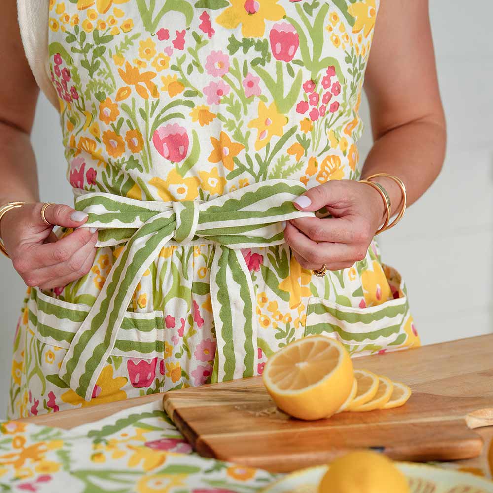 Classic modern retro floral kitchen apron. Pink tulips, yellow daffodils, and lime green leaves adorn this modern retro collection of table linens and kitchen accessories. Fresh from the garden our 70s Flower print apron will take you back to the 1970s with a retro feel, cheering up your table and home. The green and white scalloped border on this floral kitchen apron adds an extra touch of fun and whimsy to the design.