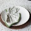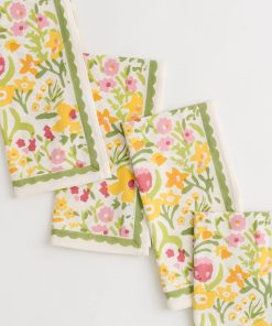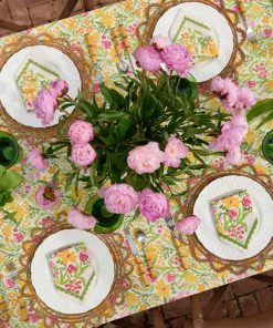 A modern and refreshing take on a classic floral napkin. Pink tulips, yellow daffodils, and lime green leaves adorn this exclusive Pomegranate hand block printed pattern that will cheer up your table with color and sunshine. Perfect for alfresco entertaining in the garden, beneath a pergola, or in your sun-filled latticework sunroom. Let your imagination go as you set your everyday table as well. The green scalloped border adds an extra touch of elegance and design. Matches well with coordinating tablecloths, table runners, and placemats.
