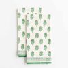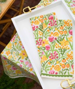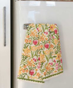 Classic modern retro kitchen tea towels. Pink tulip, yellow daffodils, and lime green leaves adorn this collection of table linens and kitchen accessories. Fresh from the garden our 70s Flower print will take you back to the 1970s with a retro feel, cheering up your table and home. The green and white scalloped border adds an extra touch a fun and whimsy to the design.