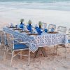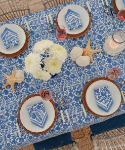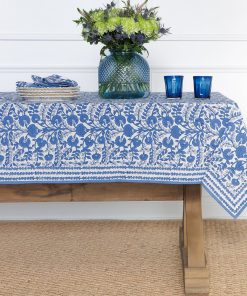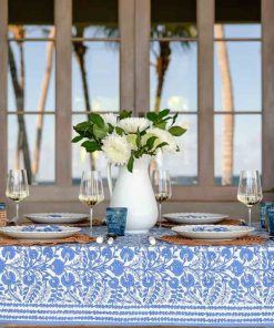 The Cactus Flower Blue tablecloth softly anchor the table with flowing florals and fresh color, setting the tone for relaxed yet polished gatherings.