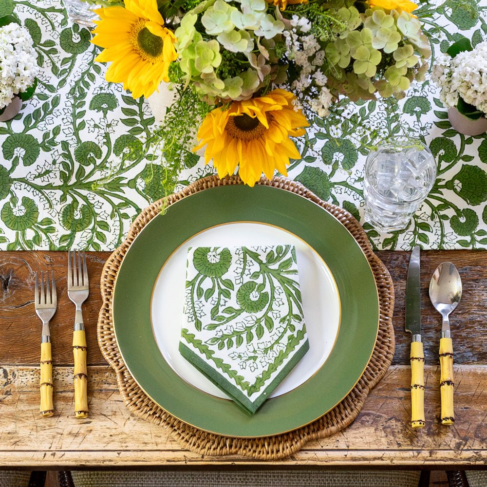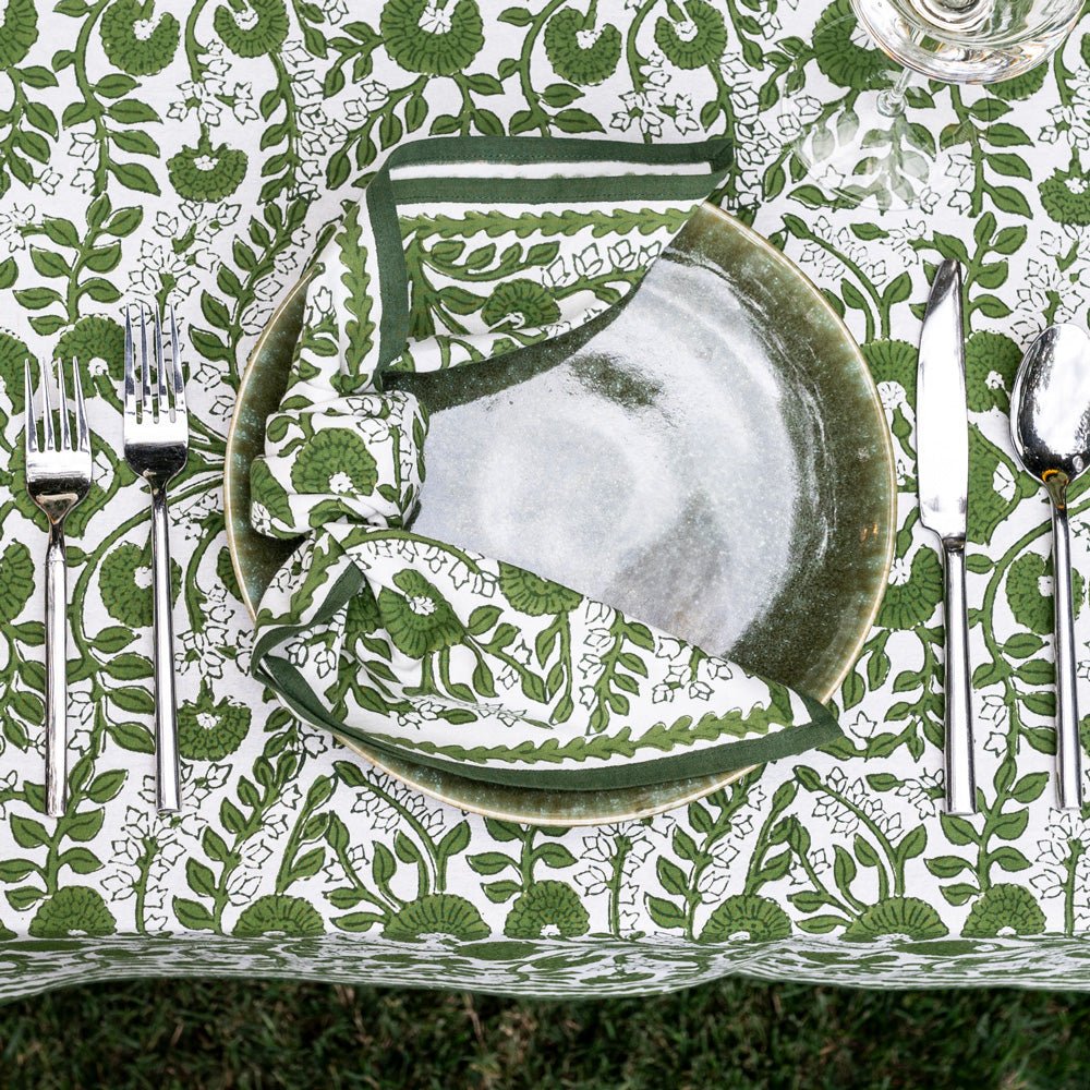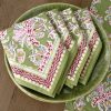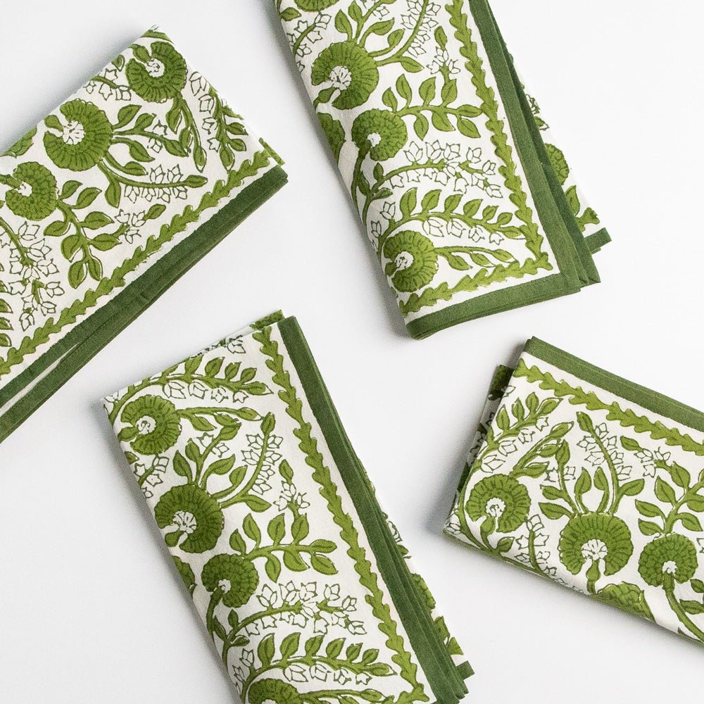 Elevate your dining experience with the Cactus Flower Lettuce Green Napkins. This set of four napkins showcases a beautiful hand block printed floral pattern in a refreshing green hue. Crafted from 100% cotton, these napkins are soft, absorbent, and easy to care for, making them ideal for both casual and formal settings. Add a touch of sophistication to your table with these charming napkins.