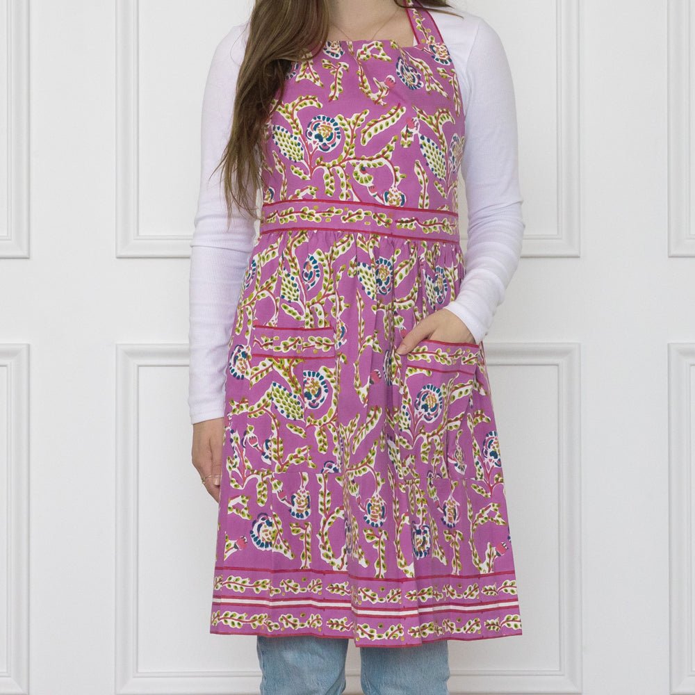 Elevate your kitchen style with our Climbing Dahlia Lilac Apron, where vibrant floral motifs intertwine against a backdrop of soothing lilac. Hand block printed with meticulous care, this apron blends beauty with functionality. Adjustable straps and a generous front pocket make it both practical and stylish—a perfect choice for the passionate home chef.