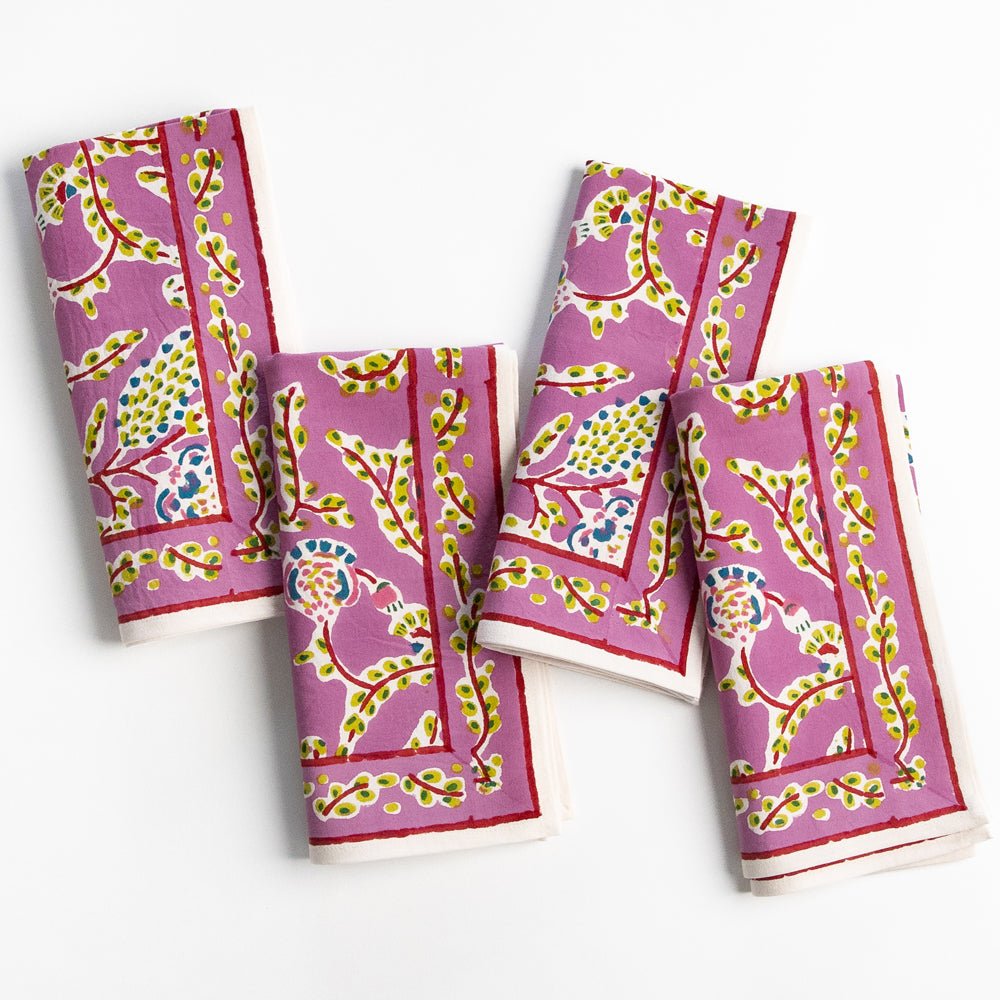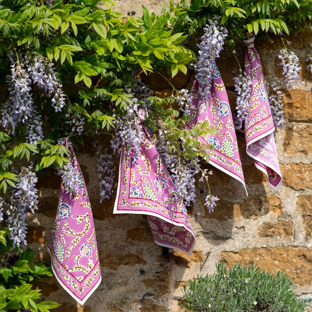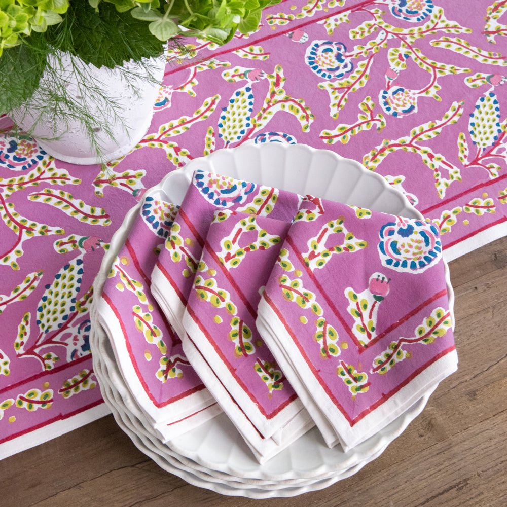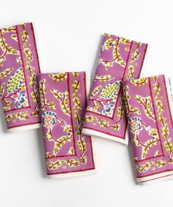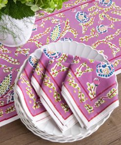 Set your table with the delicate charm of our Climbing Dahlia Lilac Napkins. Hand block printed in an whimsical floral pattern, these napkins bring a burst of color and elegance to any meal. Made from soft, durable cotton, they’re perfect for both everyday dining and special occasions. Sold in sets of four, they make a lovely addition to your table setting.