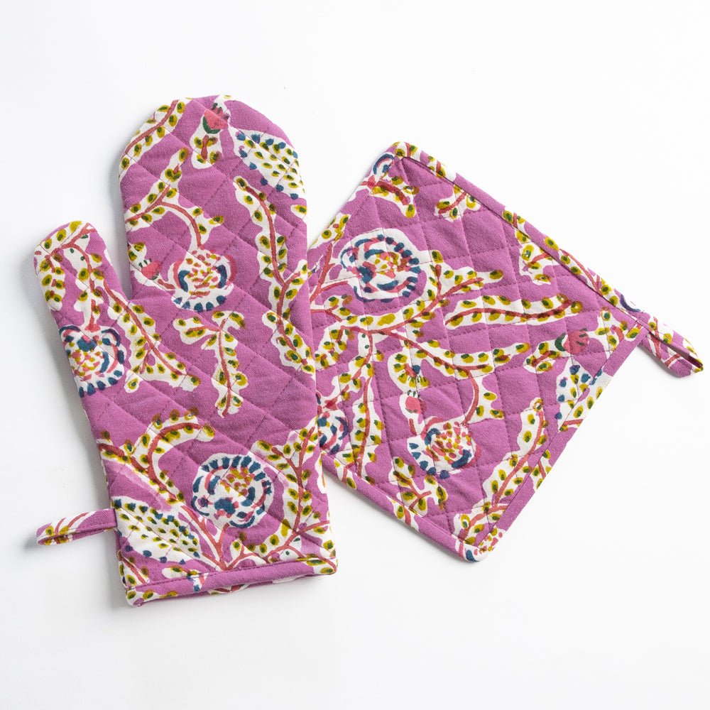 Protect your hands in style with our Climbing Dahlia Lilac Oven Mitt Set. Featuring a cheerful floral design in rich purple hues, these hand block printed mitts add a touch of whimsy to your kitchen. Designed with thick padding for heat resistance & a loop for easy hanging, they’re as functional as they are beautiful.