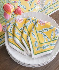 Bring some sunshine to the table with these colorful cloth napkins. Hand-block printed on soft 100% cotton, they’ve got a classic look with a fresh color palette, featuring a sunny yellow background with sky blue vines and coral dahlias abloom. Whether you’re hosting Easter Brunch for the entire family or just enjoying a weeknight dinner, pair these napkins with the matching tablecloth or table runner to brighten any occasion