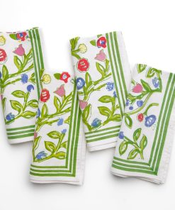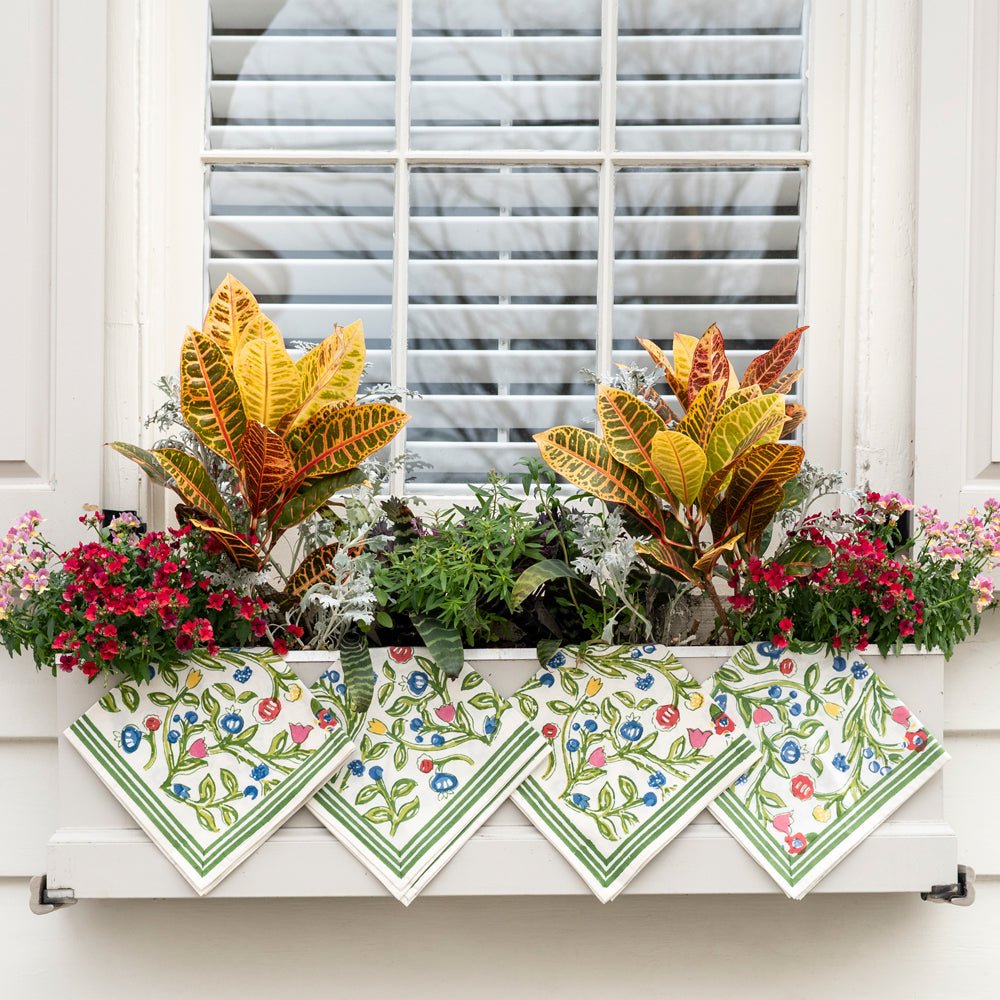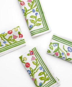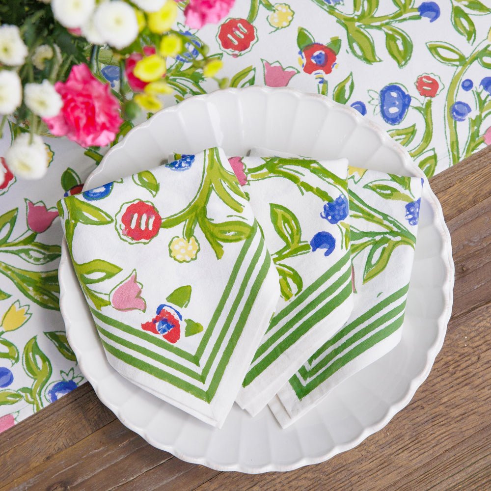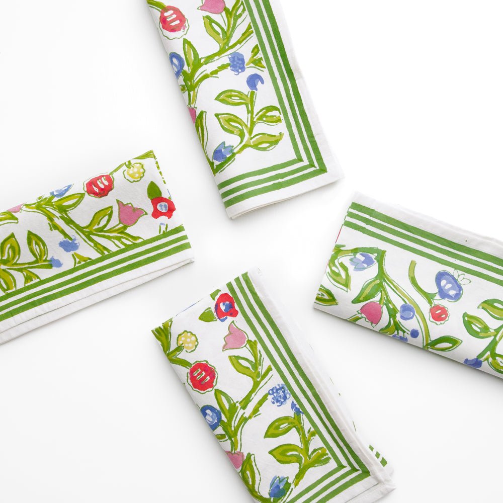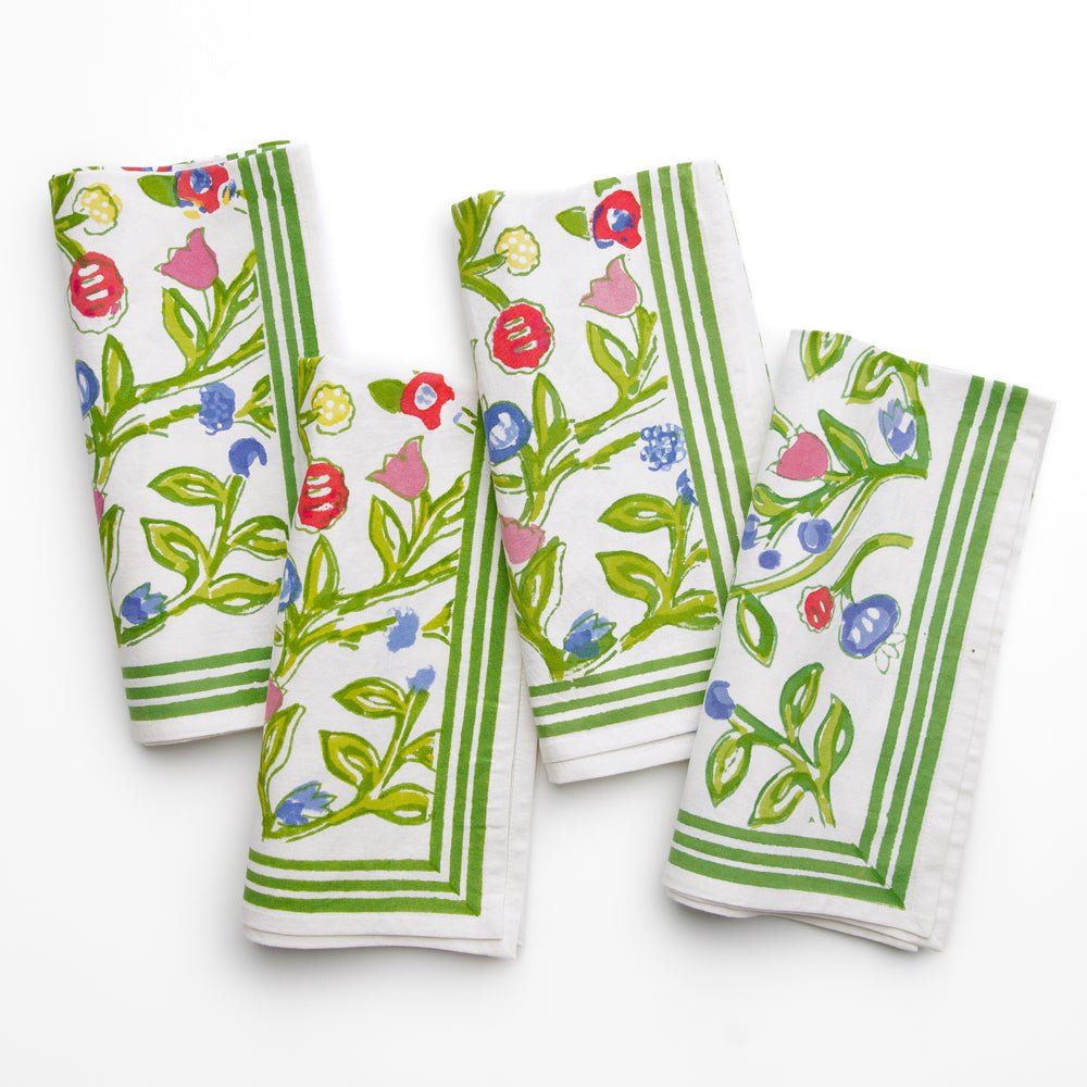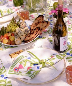 The essential Spring pattern! Hand painted flowers stretch across the vine in vibrant shades of yellow, blue and red. Our Emma Napkin is a lively, hand blocked print that will add an at-home and welcoming look to your table setting.