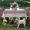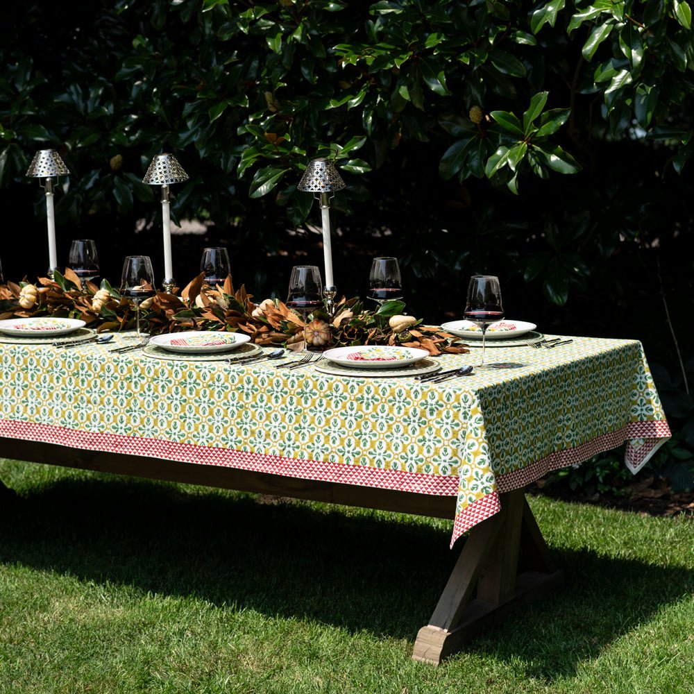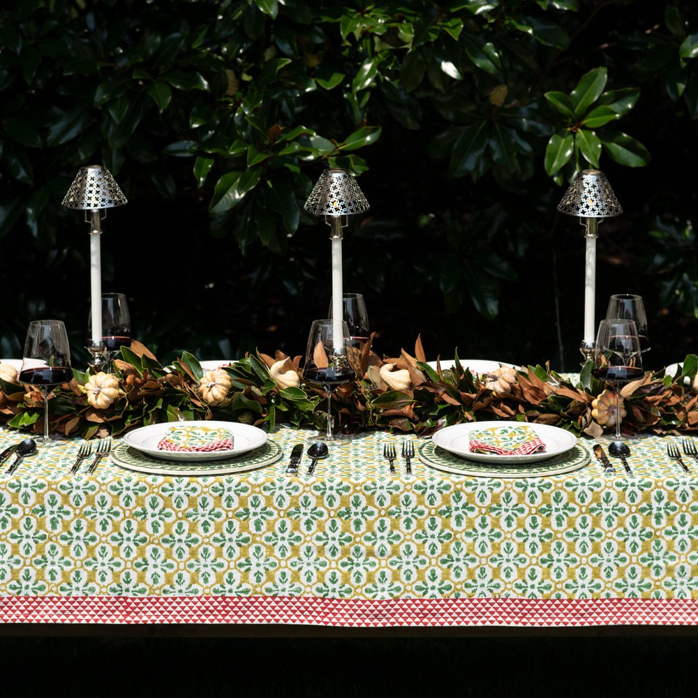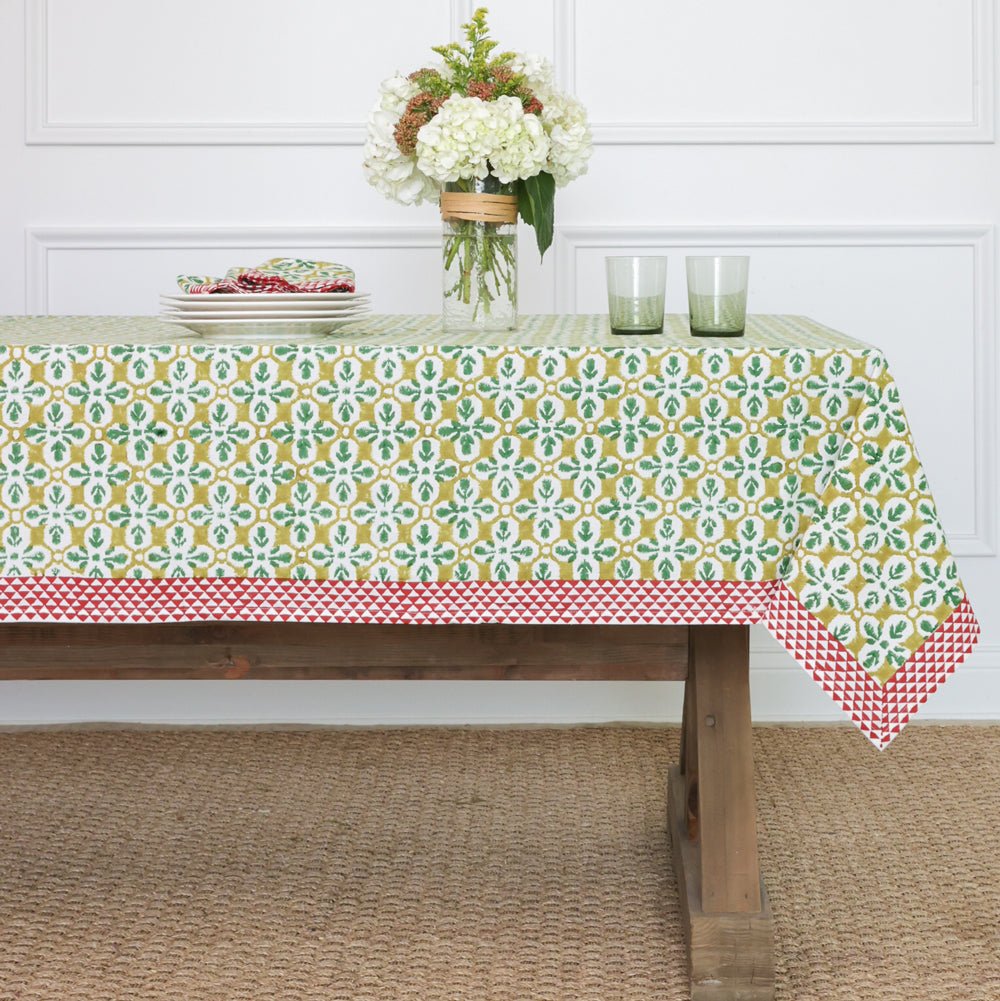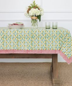 Make a bold statement with the Fleur de Lis Geo Saffron Tablecloth. Featuring a vibrant combination of green Fleur de Lis patterns, framed by a red geometric border, this hand block printed tablecloth adds an eye-catching element to your dining space. Crafted from 100% cotton, it’s as practical as it is beautiful, offering easy care and durability. Whether for everyday meals or festive gatherings, this tablecloth brings energy and style to your table.