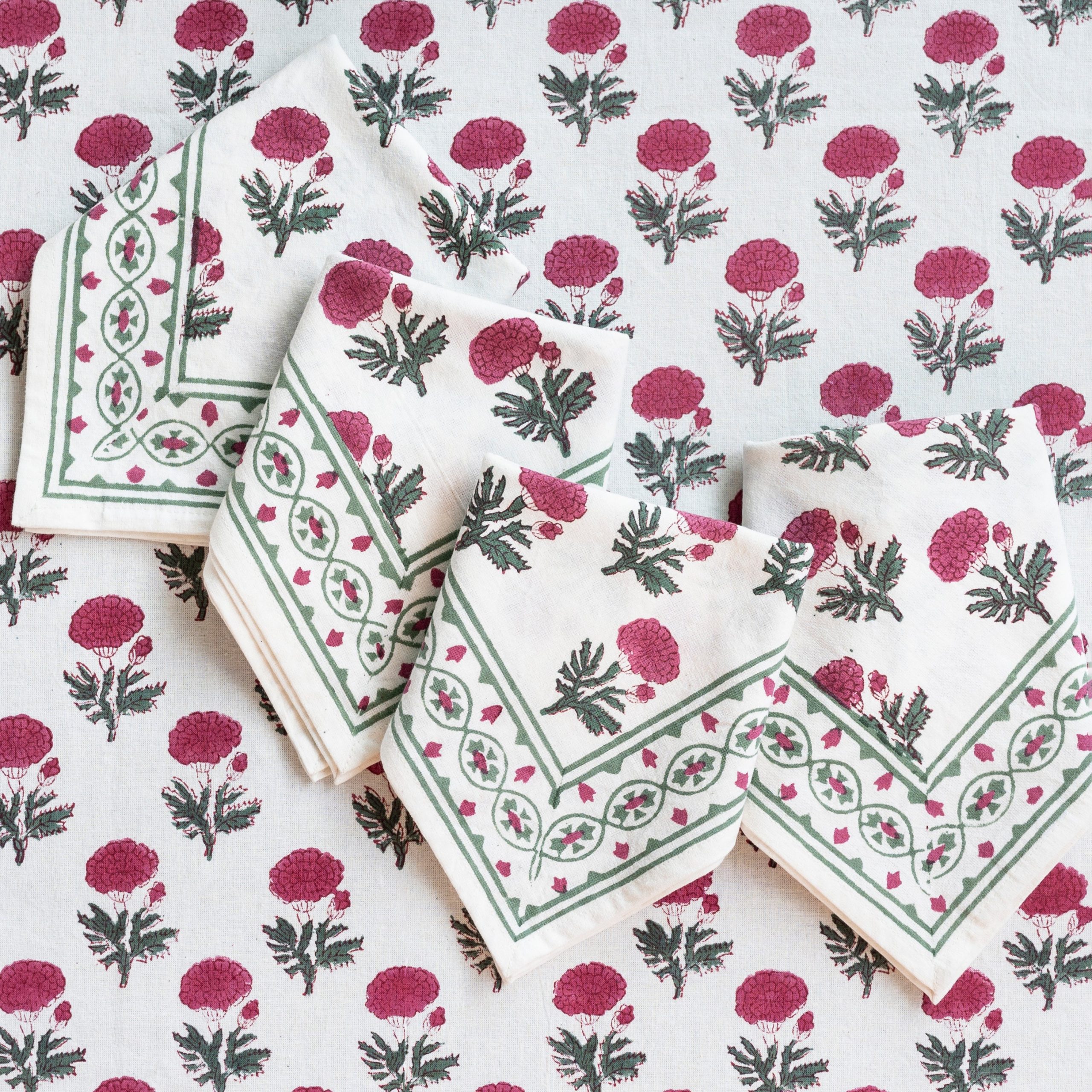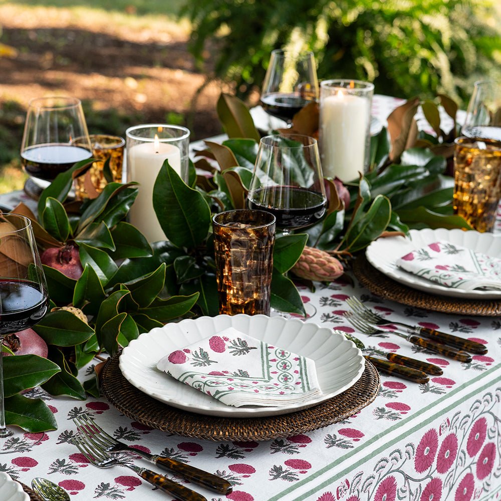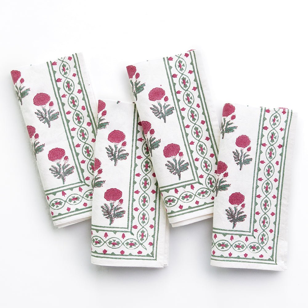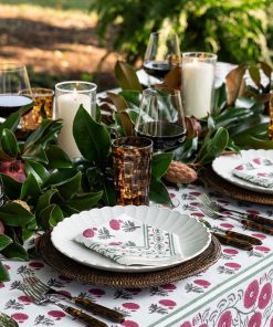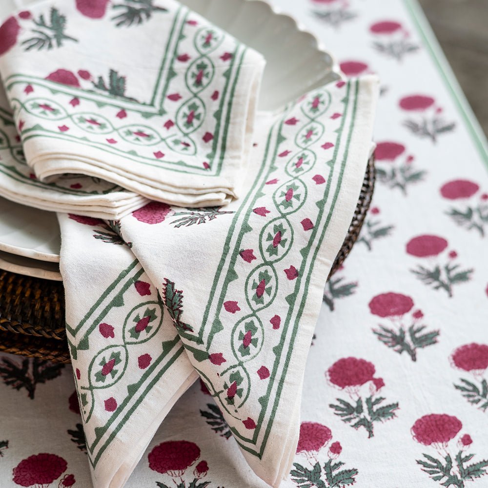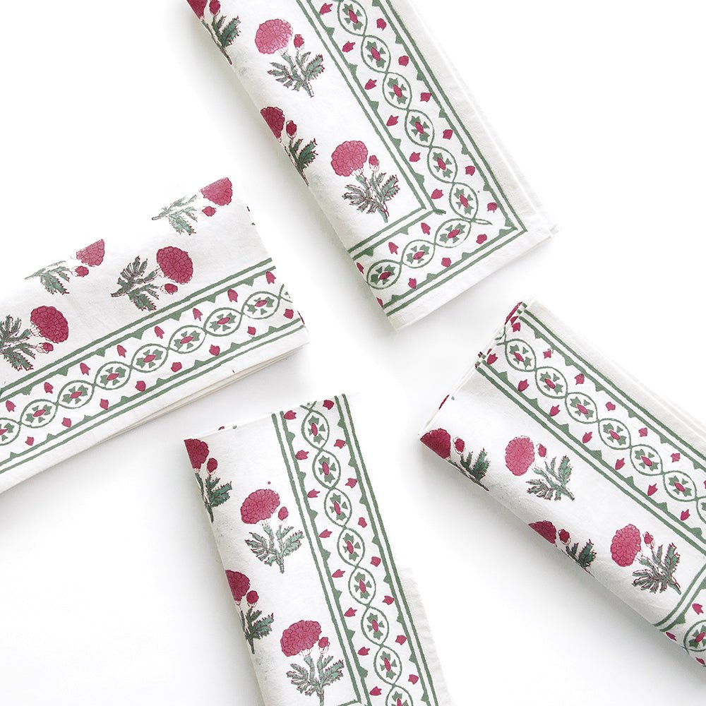 Named after an ancient and holy city in India, our Gaya Rose napkins capture the splendor, mystery and beauty of the Asian subcontinent. Printed by hand using rich dyes and carved wooden blocks to achieve a one-of a-kind design, these cotton dinner napkins make a striking display on your formal tabletop.