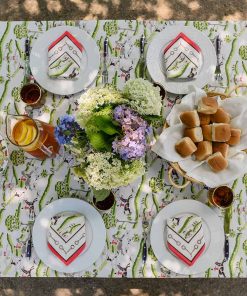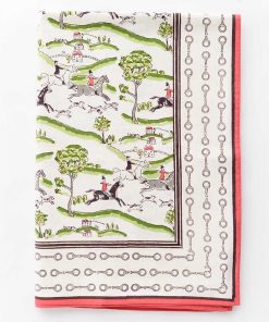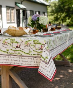 Off to the hunt! For the equestrian enthusiast, elevate your table with our exclusive equestrian hunt scene table linens. Featuring our unique hunt scene print with a red and snaffle border, this print brings sophistication to both everyday and formal gatherings with a hand drawn motif unlike anything you have seen. Have all your party guests buzzing about your table decor.