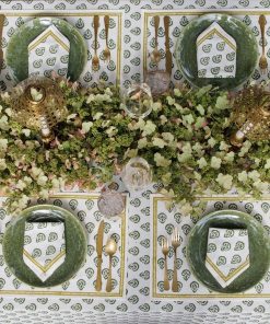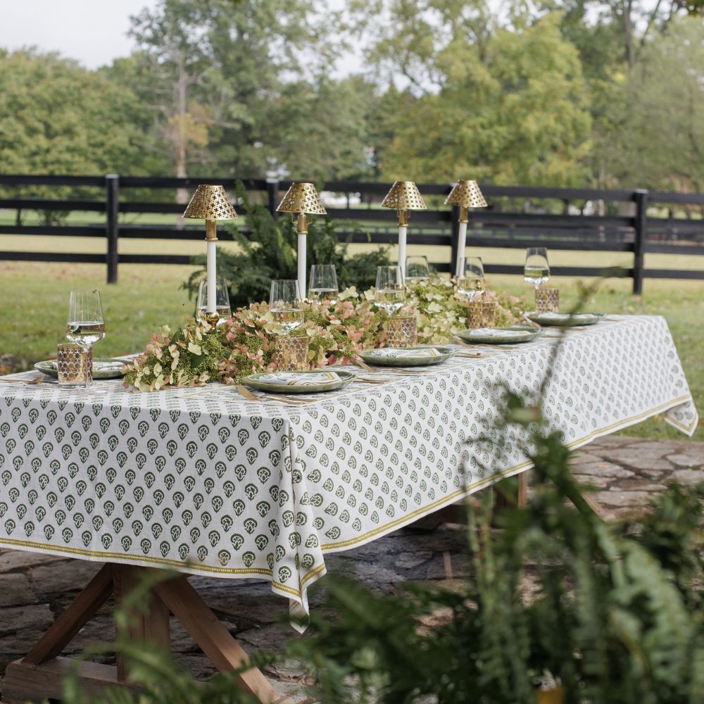 Inspired by memories from India’s childhood, this tablecloth pattern draws from her father’s graphic carnation design—a nod to his own father’s signature carnation buttonhole. In the season’s most iconic hue, Hunter Green, it provides a perfect neutral foundation for the holidays and beyond.