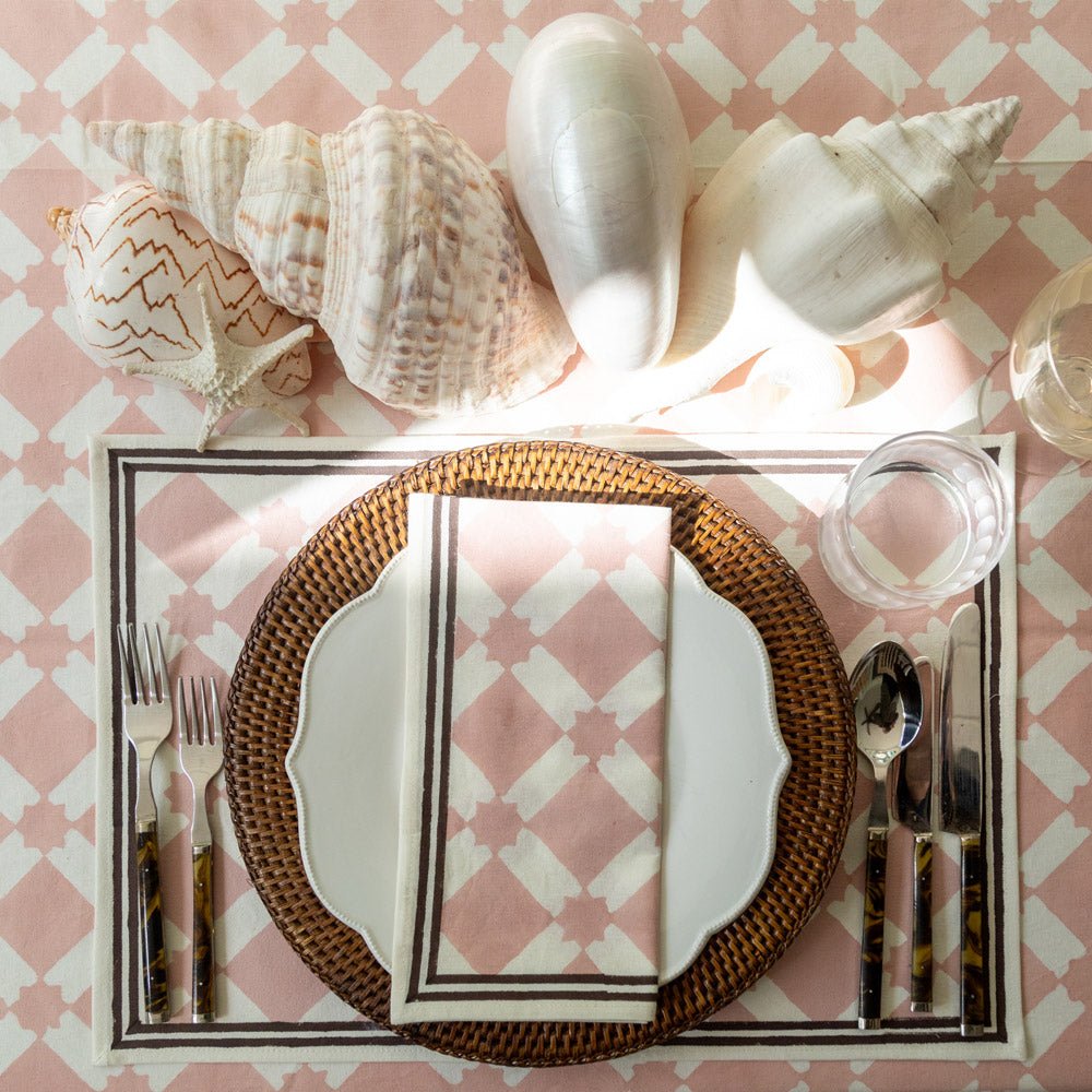 The Love Story table linen collection is made to mix and match, pair your favorite napkins and tablecloth patterns in soft blush and rich chocolate brown and bring your tablescape to life. Explore this beautiful table linen collection by India Hicks Home.
