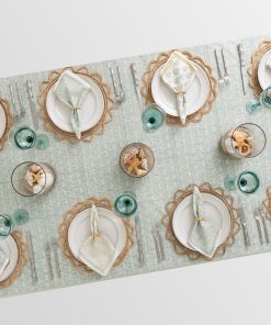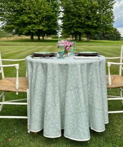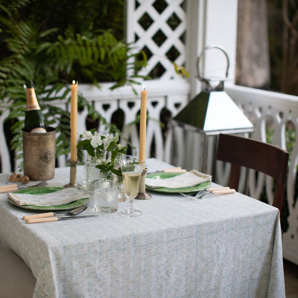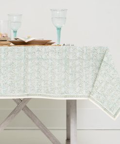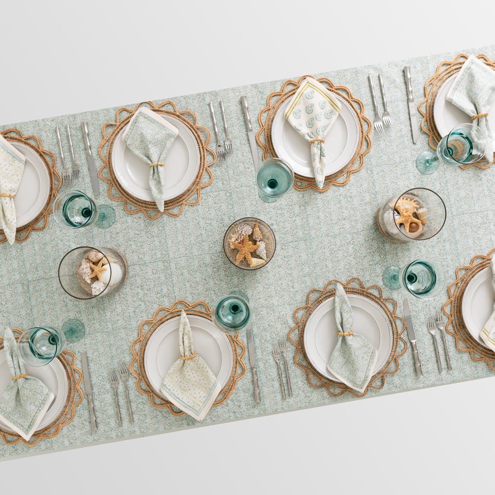 This beautiful 100% cotton, hand blocked printed Tablecloth in Seashell Seafoam is intended to be mixed haphazardly together with the other patterns, just as our families are.