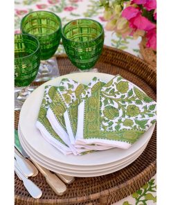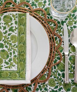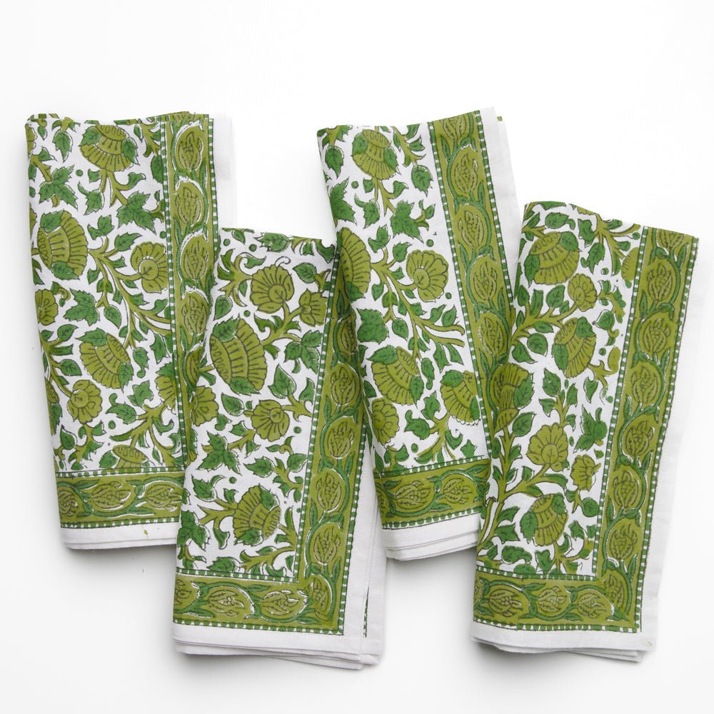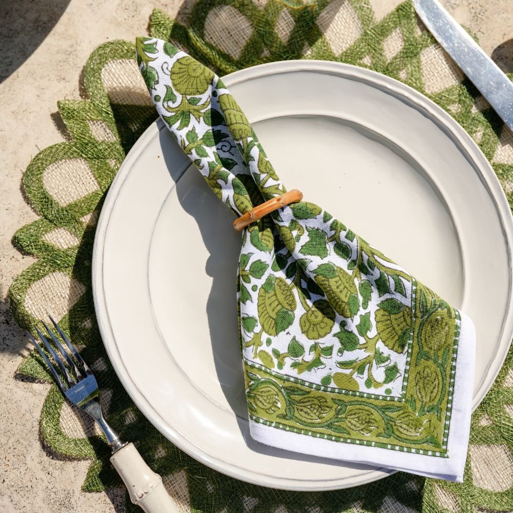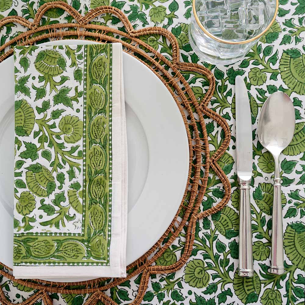 These Jade Blossom Napkins are little hits of color and craft that instantly elevate a place setting. Hand-block printed with a painterly floral motif, they bring warmth, texture, and personality to the table.