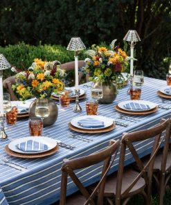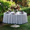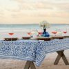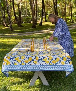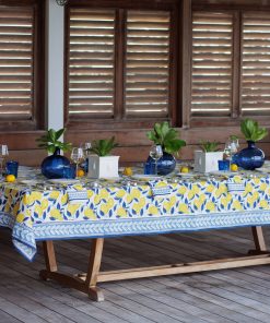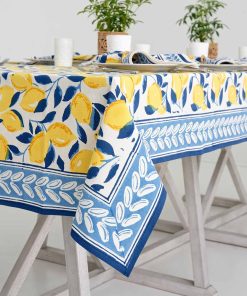 Vibrant yellow lemons on rich navy branches make up this cheerful, block-printed pattern. A cool pitcher of lemonade will look right at home on this tablecloth, which pairs beautifully with other blue and white patterns and jute placemats.