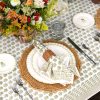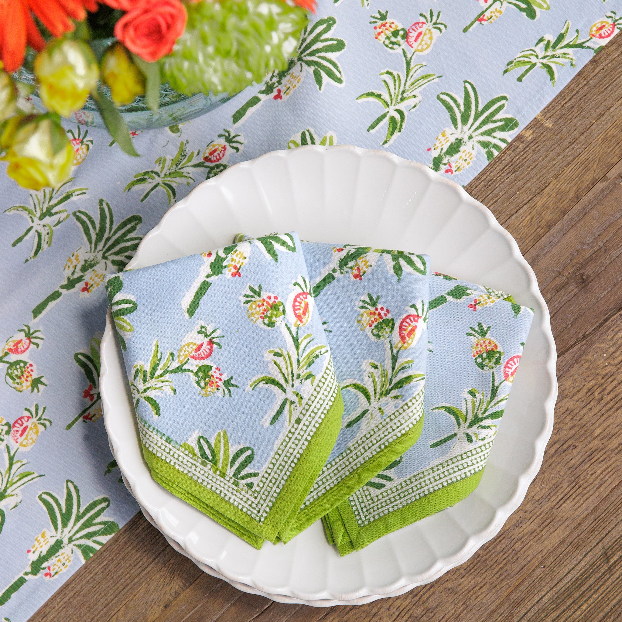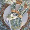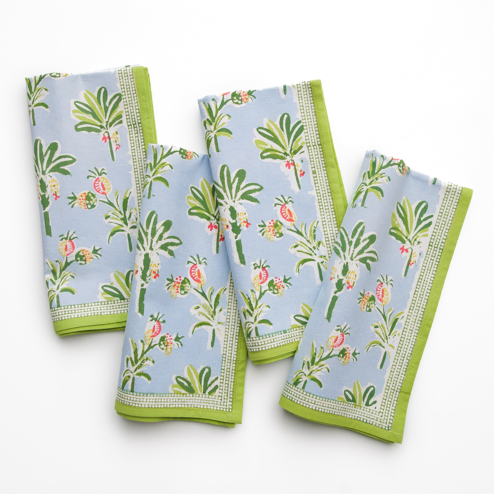 Tropical island palms and pineapples adorn this coastal themed light blue and green Pomegranate hand block printed cotton napkin. Complement your breakfast, lunch and dinner table with these refreshing and original table linens.