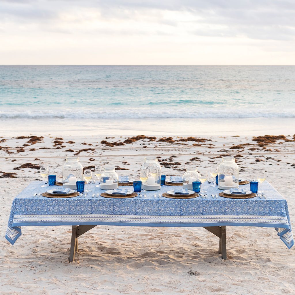 Each piece is hand-block printed by skilled artisans, giving the design its signature painterly look and subtle variations that make every piece feel special. The layered blues feel fresh and relaxed, perfect for everyday meals, impromptu gatherings, and those dinners that linger just a little longer than planned.