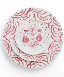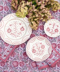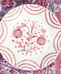 A beautiful addition to your next dinner party, these hand-painted ceramic Pomegranate Duet Rose Salad Plates offer a delightful balance of elegance and versatility. Designed by Pomegranate founder and creative director, Angela Beck, and produced by skilled artisans in Portugal. The intricate hand-painted pomegranate and floral designs in a rosy pink tone, are the perfect size plate for serving fresh salads or side dishes. Sold as a set of 2, these plates pair well with the Pomegranate Duet Dinner Plates and Appetizer Plates.