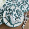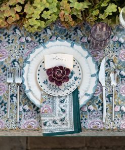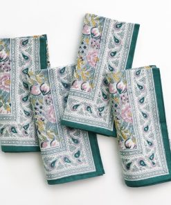 Enhance your dining experience with the subtle charm of our Pomegranate Garden Teal & Lilac Napkins. This set of four napkins displays a floral pattern in shades of lilac and teal, bordered by a delicate paisley design. Crafted from soft, hand block printed cotton, these napkins combine durability with elegant design, perfect for daily use or special occasions.