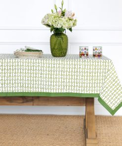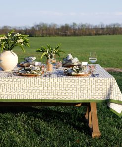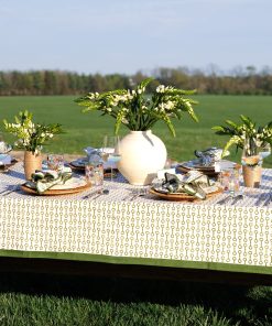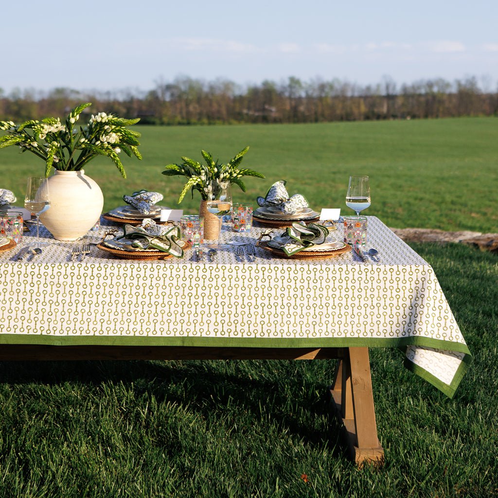 Set the table in equestrian style with our Pony Club Green Tablecloth. Featuring a hand block-printed snaffle bit pattern in a classic green, this design is both timeless and playful—perfect for every occasion. The solid green border frames the print beautifully, giving your table a polished look. Inspired by the heritage of world-renowned Gainesway Farm, where our brand got its start, this tablecloth is a must-have for those who appreciate a touch of the equestrian lifestyle in their home.