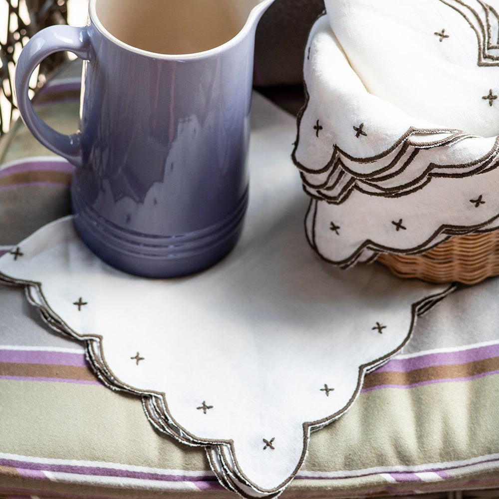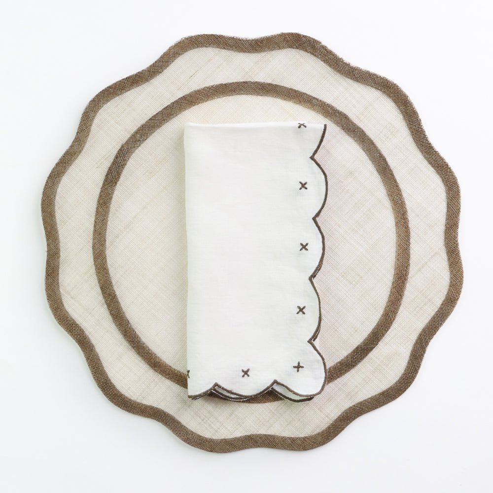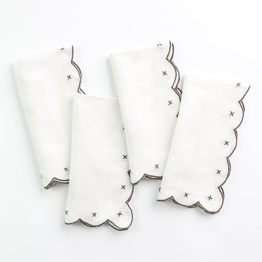 Add a touch of timeless charm to your table setting with our Scalloped Knot Brown Embroidered Linen Napkin Set. These soft, luxurious napkins feature delicate brown embroidery and scalloped edges, creating an yet elegant look that complements any dining style.
