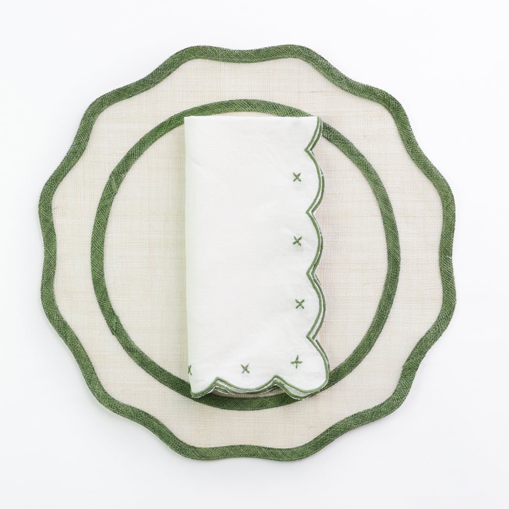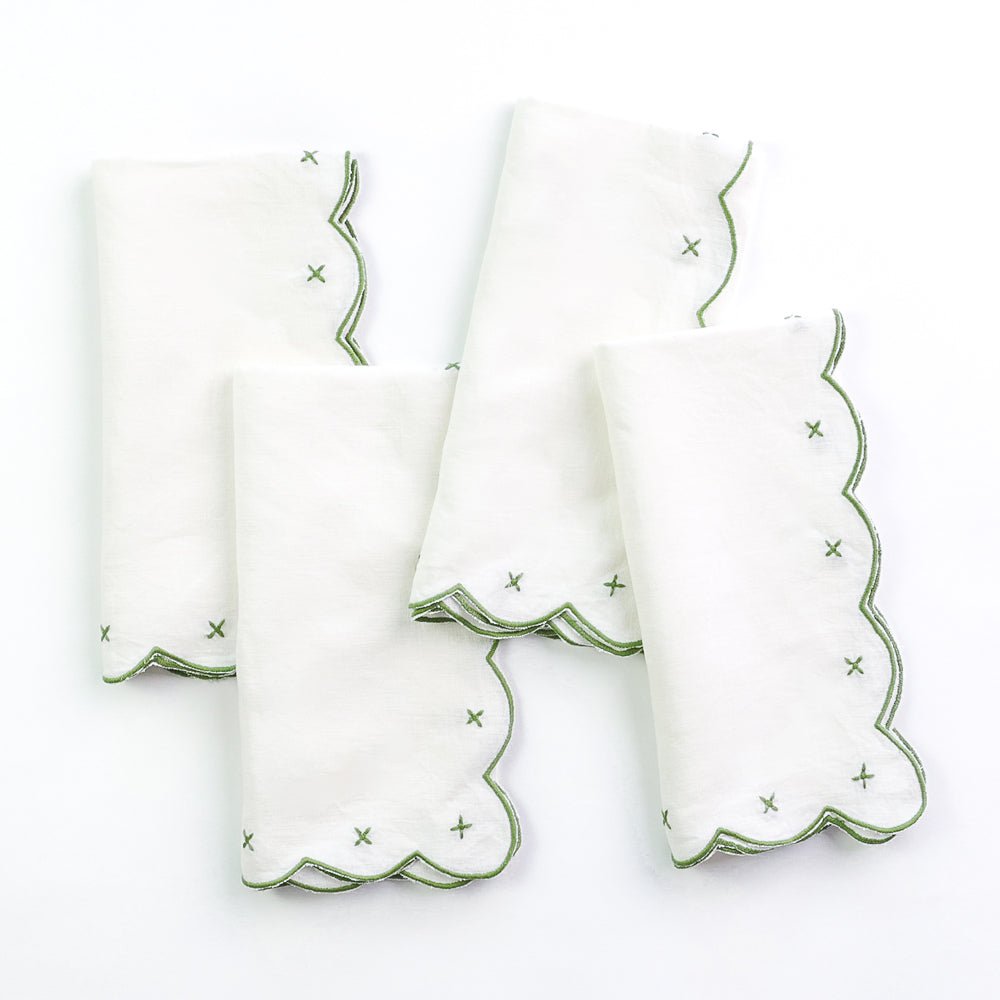 These elegant white linen napkins feature intricate green embroidery and a delicately scalloped edge. Perfect for adding a touch of sophistication to any table setting, the set of four is sure to impress guests and elevate your dining experience.