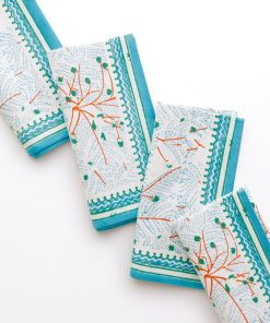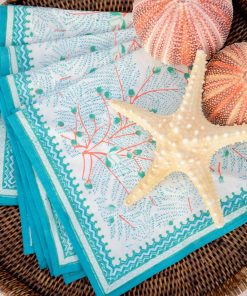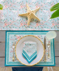 Let your table sail away with our Sea Fan napkins, where a breezy coastal aesthetic meets brightly colored hues. Hand block printed in shades of teal, aqua, and vibrant coral, these cloth napkins bring the beauty of the sea to every meal. If you’re hosting a seaside-inspired dinner or just adding a touch of coastal inspiration to your everyday table, these napkins will make waves at your next gathering.