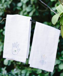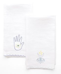 Bring some positive energy to your kitchen with our Starry Eyed Moon & Hamsa Embroidered Linen Tea Towels. With meaningful symbolism, it is a beautiful addition to your home or a thoughtful gift. Each tea towel in this set carries a unique and powerful embroidered design: