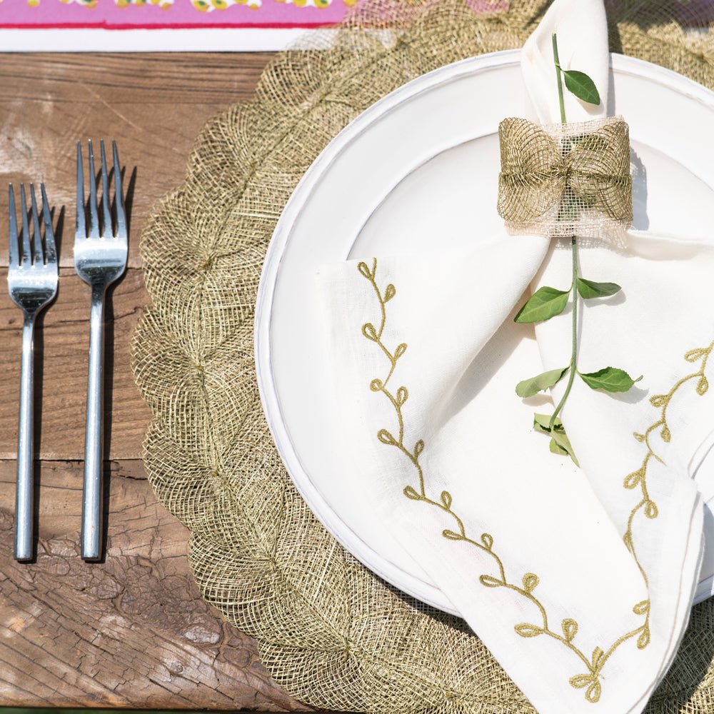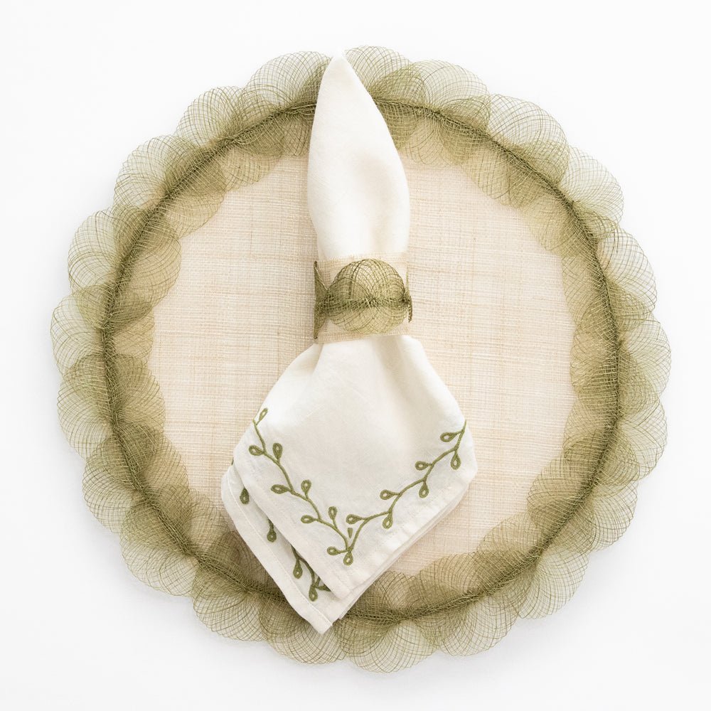 Expertly crafted, the Twig & Bud Moss Embroidered Linen Napkin Set adds a touch of natural elegance to any dining experience. Made of high-quality white linen, each napkin is adorned with a delicate moss green twig and bud border. Enhance your table setting with this beautiful set of 4.